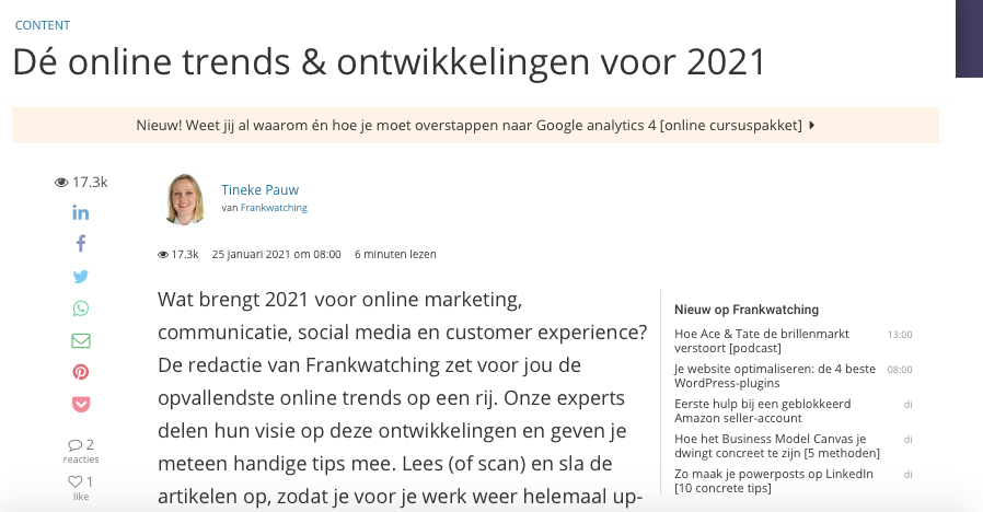 Activiteiten Om dit leerdoel te behalen heb ik wekelijks tijd genomen om een paar websites te bekijken en artikelen te lezen. Doordat ik mijn voelsprieten uit heb gezet naar nieuwe dingen kon ik tijdens projecten sneller op nieuwe en originele ideeën komen. Ik heb meer inzicht gekregen in lopende trends en actueel nieuws, en kan hierdoor kansen en mogelijkheden zien bij projecten. Daarnaast ben ik ook wat beter geworden in mijn taalvaardigheid omdat hier vaak ook vaktermen gebruikt worden die in ons vakgebied ook voorkomen.